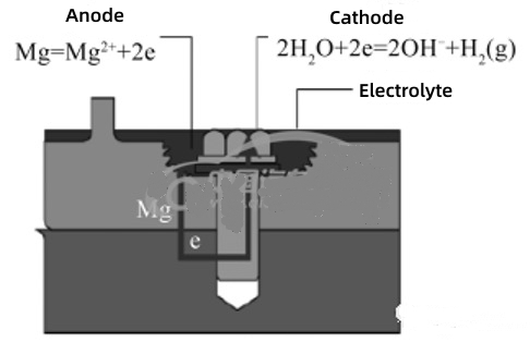 The chemical properties of magnesium are very active, and the standard electrode potential is -2.36V, which leads to poor corrosion resistance of magnesium alloys. In the electrolyte, magnesium is prone to serious galvanic corrosion as the anode, while the metal as the cathode does not corrode. Usually, magnesium alloy shells and fasteners are generally connected by dissimilar metals, which are prone to galvanic corrosion. The corrosion model is shown in Figure 1. The galvanic corrosion of magnesium alloy shells and fasteners is two reaction formulas, namely, the anodic reaction of magnesium and the cathodic reaction of other metals.