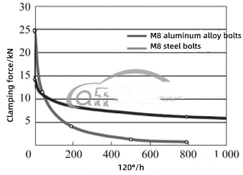 Compared with steel bolts, in addition to fundamentally solving the electrochemical corrosion of magnesium alloy shells, aluminum alloy bolts with magnesium alloy shells have the following other advantages: (1) Each fastener can reduce 60% of the weight, and using it on the flange surface of the electric drive assembly can greatly reduce the weight of the assembly. (2) The thermal expansion coefficient of magnesium alloy and aluminum alloy is similar, and the thermal expansion coefficient of steel is about 1 time different. The threaded connection pair of steel bolts and magnesium alloy shells will generate additional stress due to temperature changes, often causing the compressive stress on the surface of the shell under the bolt head to exceed the compressive strength of the magnesium alloy, resulting in material creep on the surface of the magnesium alloy shell, and eventually leading to attenuation of the preload of steel bolts. The combination of aluminum alloy bolts and magnesium alloy shells is beneficial to eliminate or reduce thermal stress, reduce the creep of magnesium alloy shell materials, and improve the ability to maintain the preload (Figure 3). (3) The rigidity of the aluminum alloy is small, and the elongation corresponding to the same axial force and the tightening angle is great, so it is suitable to be tightened by the torque angles. When the connected parts are subjected to external loads, the alternating load on the bolts can be reduced. (4) The density coefficient of aluminum α is greater than 1, and an oxide layer can be formed on its surface to prevent corrosion. Therefore, aluminum alloy bolts do not require additional surface treatment.