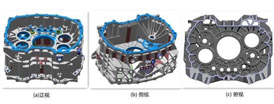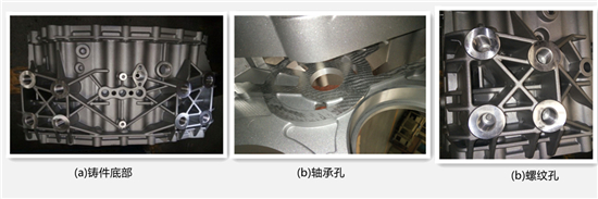Figure 1 is the die casting part of a certain type of automobile gearboxes. The material is ADC12 aluminum alloy. The outline size is 550 × 444 × 301 mm, and the total mass is about 27.3 kg. It is a large-scale die casting part. This product has a complex structure, with many ribs and holes. The main wall thickness is 7 mm and the wall thickness is uneven. It can be seen from Figure 1 that the outer side of the product has holes, and the slide block structure needs to be designed in the 4 directions of the mold. It can be seen from Figure 1a that the product has a large number of holes, with thicker walls in partial areas, and high air tightness requirements for the bearing holes and cylinder holes are put forward. It can be seen from Figure 1b that there is a deep cavity structure inside the product, and the center part of the large bearing hole at two sides cannot be manufactured by the die casting process, which requires complete filling and needs to be connected to the bottom. Later, it needs to be processed by machining. After this part is connected, there is a greater risk of internal defects due to the deep cavity and wall thickness problems. This is difficulty 1. In addition, there are many dense side holes. When the cooling system of the mold is arranged, it is difficult and complicated. At the same time, there are 8 threaded holes that are different from the direction. There is an included angle between the two and it is impossible to loose core in the same direction. It is necessary to design the core-pulling mechanism separately to ensure the internal quality. This is difficulty 2. See Figure 1b and Figure 1c.
