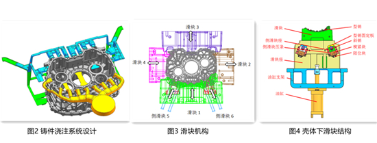 After adopting this kind of gating system, the mold's parting surface can only be selected close to the end faces of the large bearing holes on both sides. The shallow cavity on the front is designed on the fixed mold, while the deep cavity on the back is designed on the movable mold. Four sliding blocks at the up, down, left, and right of the four sides. The complex side shown in Figure 1b is located at the bottom of the mold.
