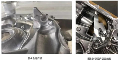 After machining, a leak test was carried out, and it was found that there was a leak between the two oil passage holes. The product's qualification rate was 20%. The product was sectioned and it was found that the large shrinkage cavity between the oil passages was the main cause of the leakage. The sectioned picture is shown in Figure 2.