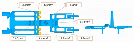 According to the above analysis results, the gating system of the die casting was optimized. Expanded the area of the flow gate at A and D from 3.3mm² to 8.6mm² to reduce the metal liquid resistance in these two places. The optimized gating system is shown in Figure 3.