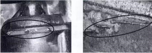 (1) The slag inclusion part at the gate (2) The enlarged view for the slag inclusion part