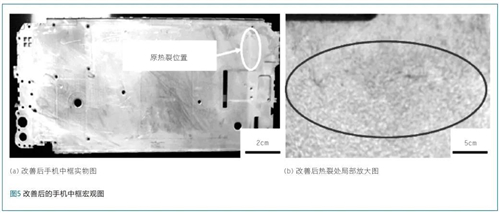 die casting alloys to improve the microstructure of the alloy and make the α-Al phase distribution uniform. At the same time, low-temperature annealing at temperatures between 250 and 290℃ is adopted and kept for 10 to 16 seconds, thereby reducing the internal stress and improving the strength. After the production process of the die-cast ADC12 aluminum alloy mobile phone middle frame was controlled according to the above measures, thermal cracking didn't happen for the casting, as shown in Figure 5.